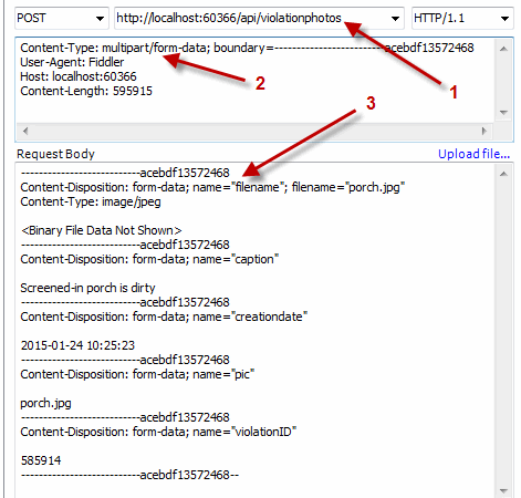 2. The content type must be set as multipart/form-data. In the request header, "Content-Type: multipart/form-data" must be present.
